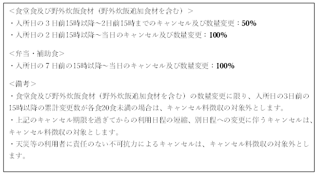 本HP内「利用のご案内」にある「食事・野外炊飯・弁当・アレルギー」をご確認ください。3 利用に係る変更・キャンセルについて