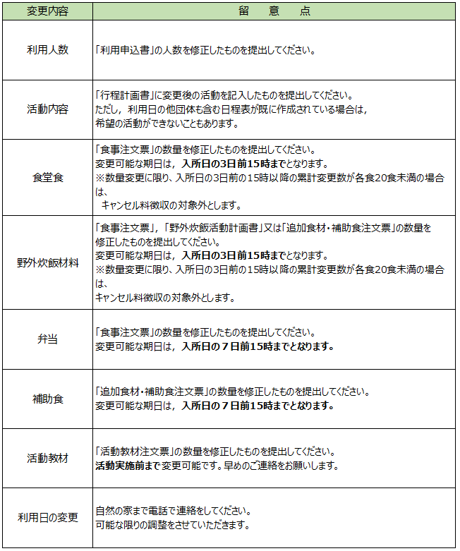利用人数,活動内容,食数等に変更があった場合は,速やかにご連絡ください。変更の期限については,次の表をご参照ください。期限が過ぎた場合は,数の変更は