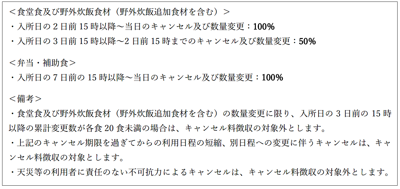 本HP内「利用のご案内」にある「食事・野外炊飯・弁当・アレルギー」をご確認ください。3 利用に係る変更・キャンセルについて