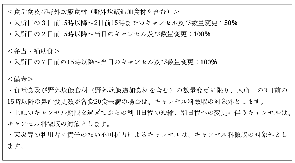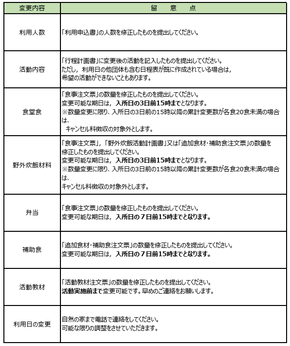 利用人数,活動内容,食数等に変更があった場合は,速やかにご連絡ください。変更の期限については,次の表をご参照ください。